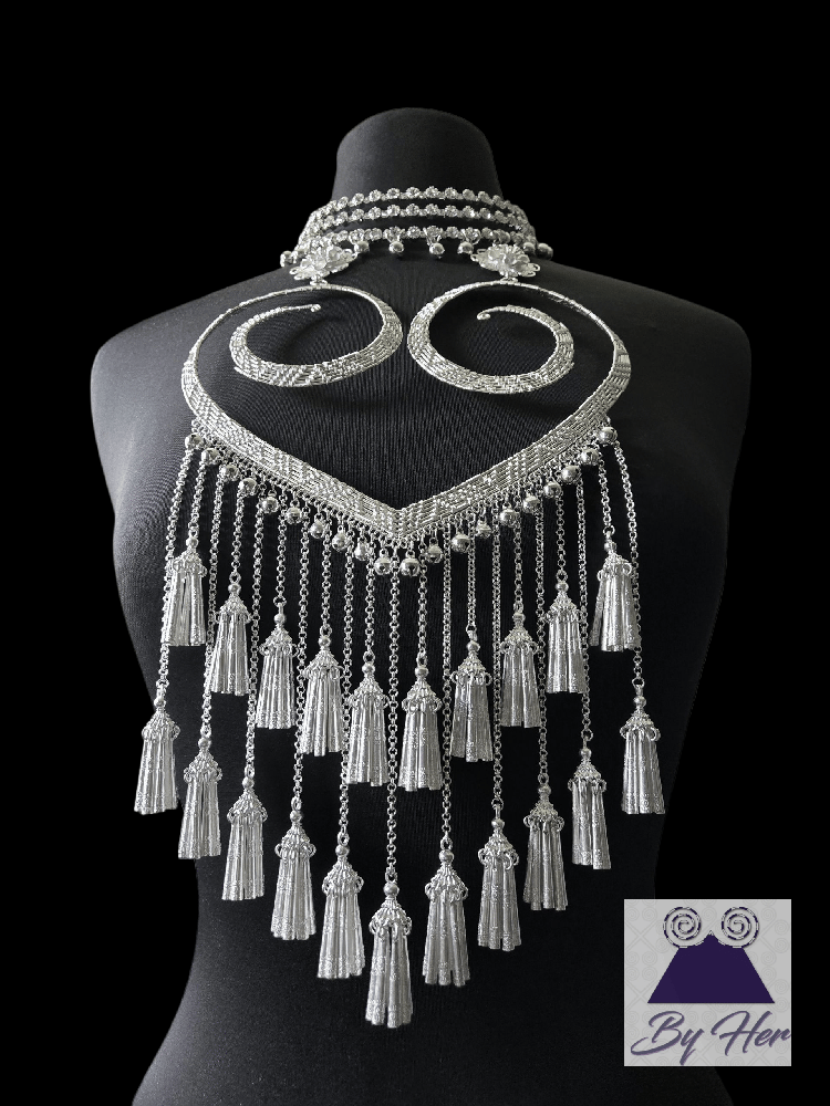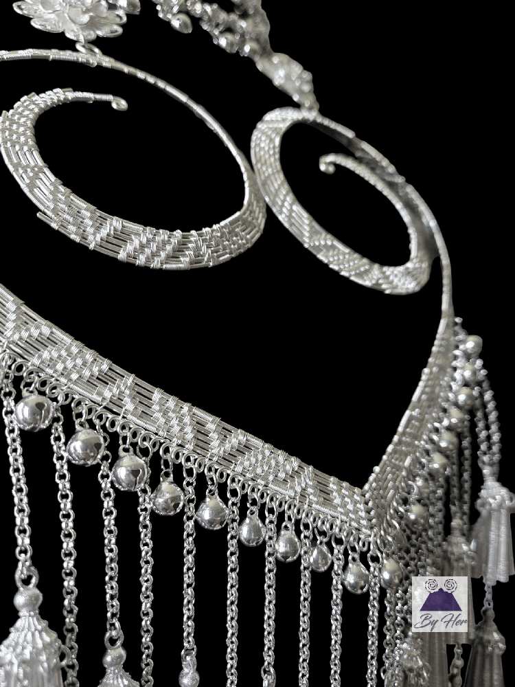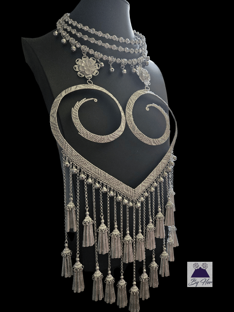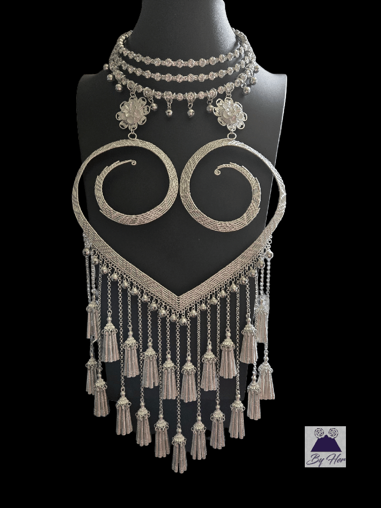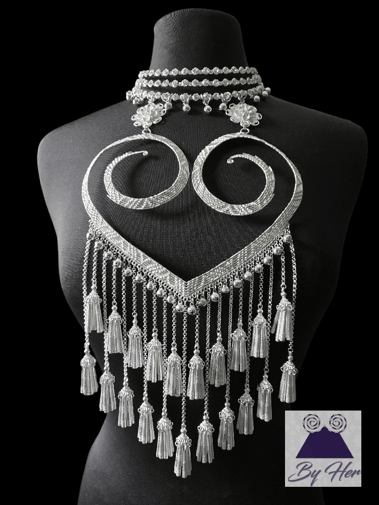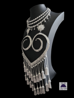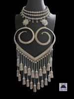 This beautiful unique handcrafted necklace features intricate oversized woven heart design pendant embellished with bells and waterfall style Hmong tassels. The neck piece is a 3 layer expandable rhinestone collar to 18 inch with chain closure.