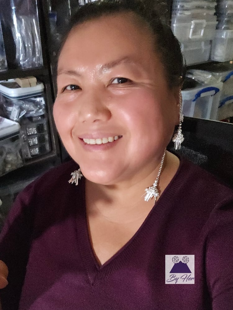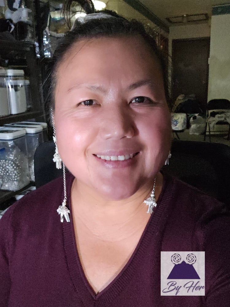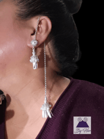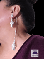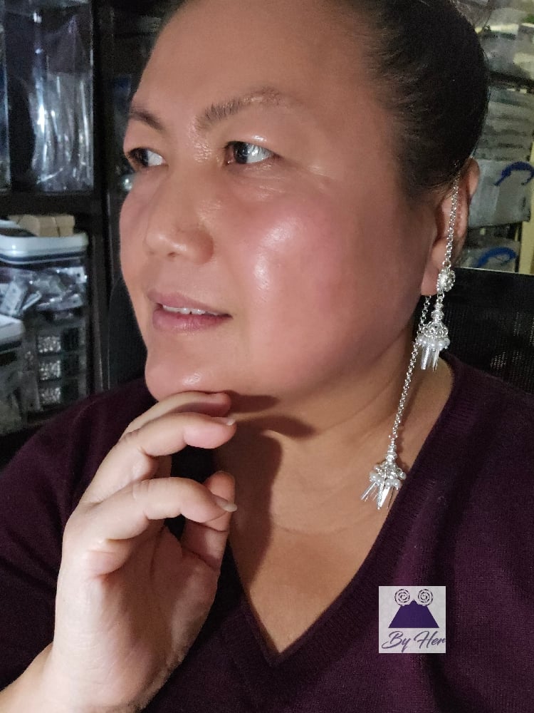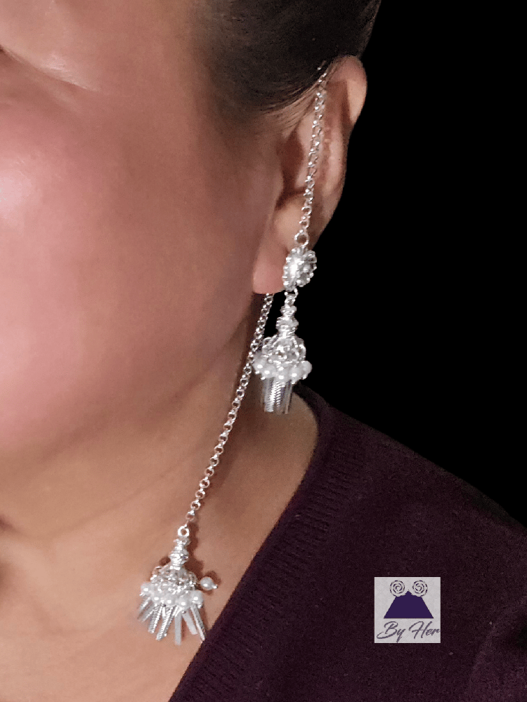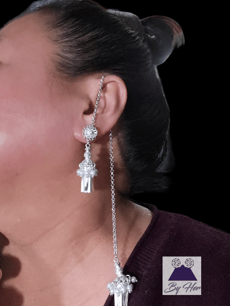 Beautiful flower Tassel earrings embellished with simulated pearls and strand of chain that drap over the ears to dangle in the back Hmong tassel.